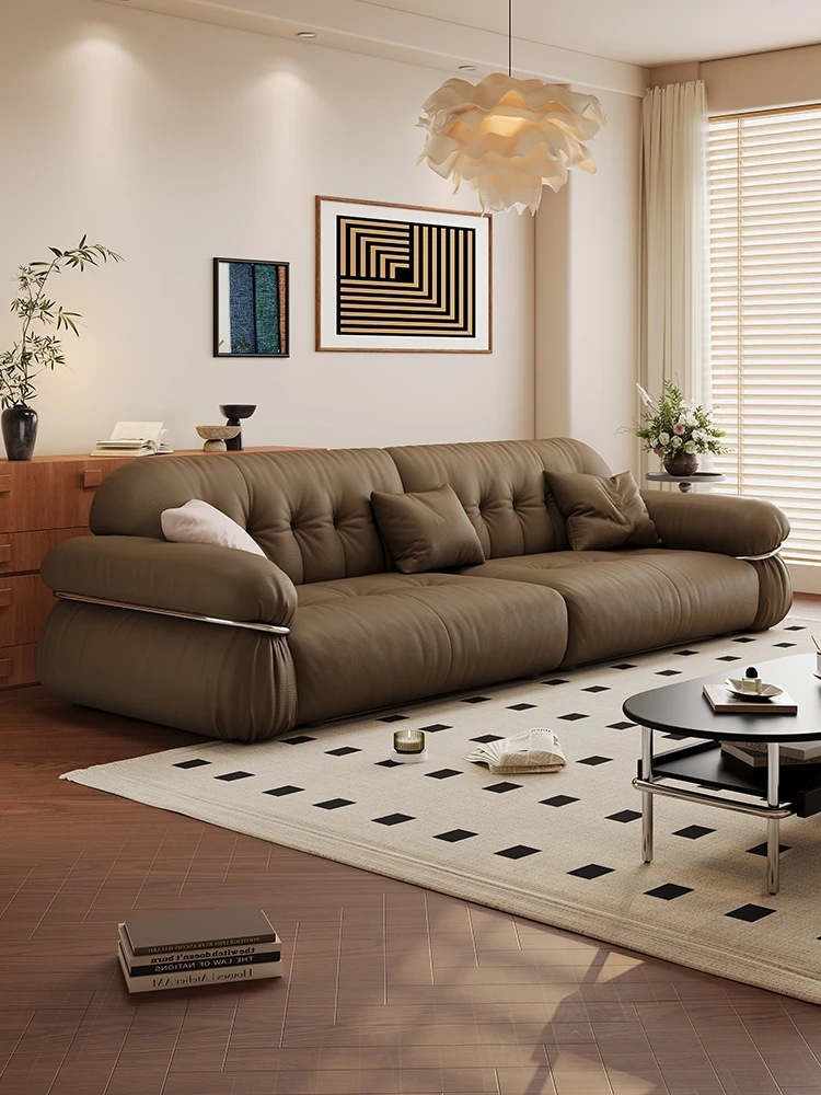 イタリアンモダンラグジュアリー: スチールフレーム・黒糖クラウド風デザインの新作ソファ2025年モデル!大小リビングにぴったりのシンプルでエレガントな本革ソファ。