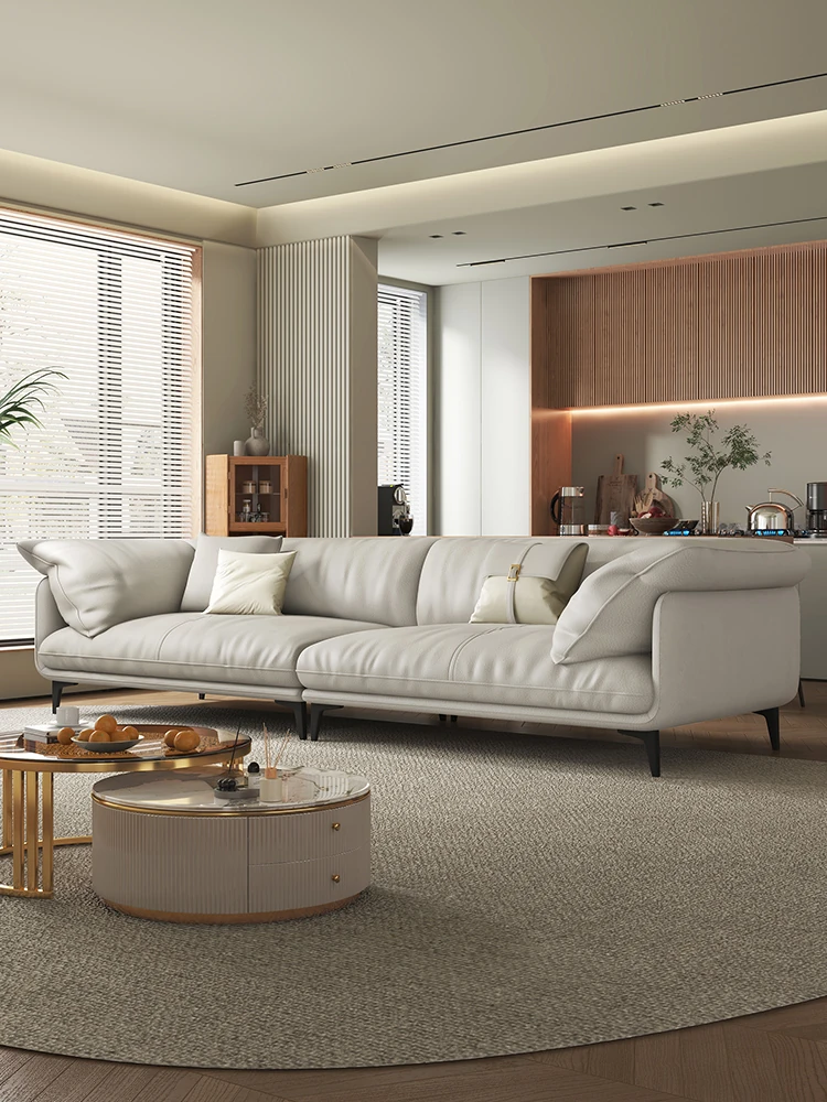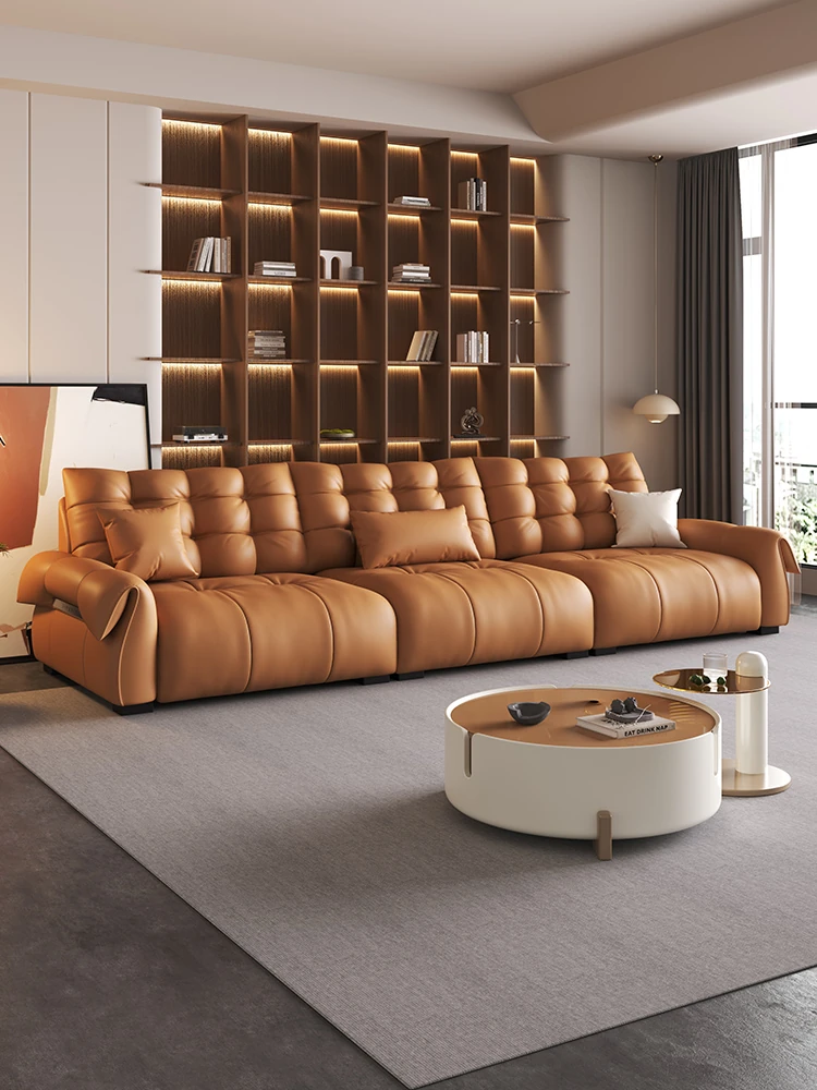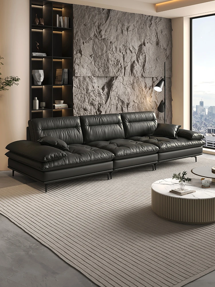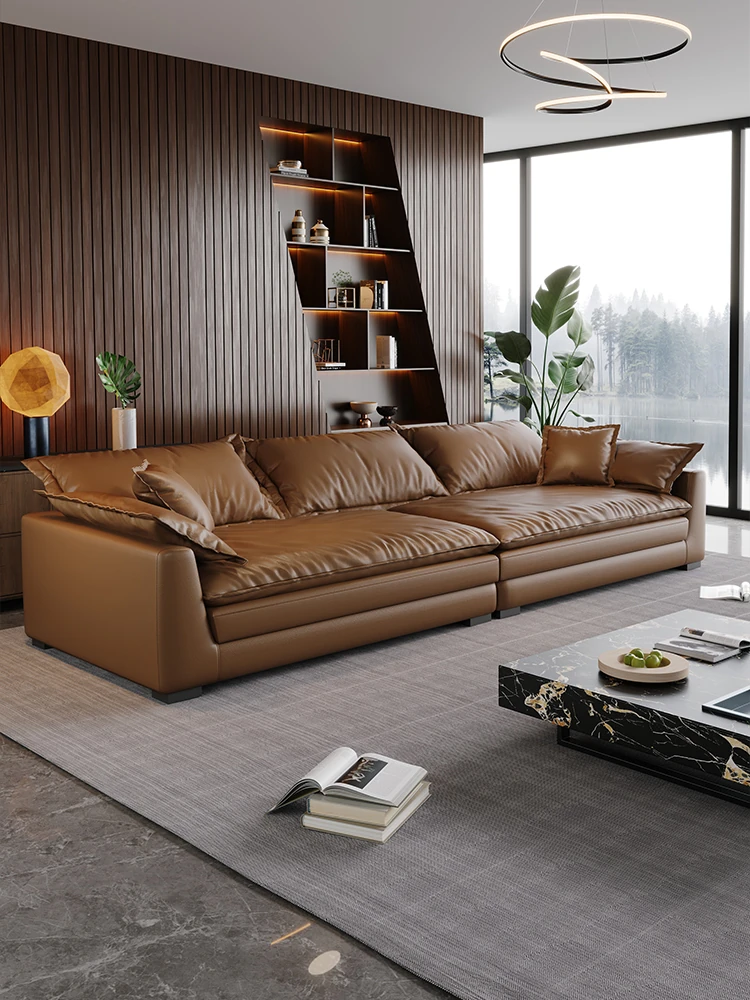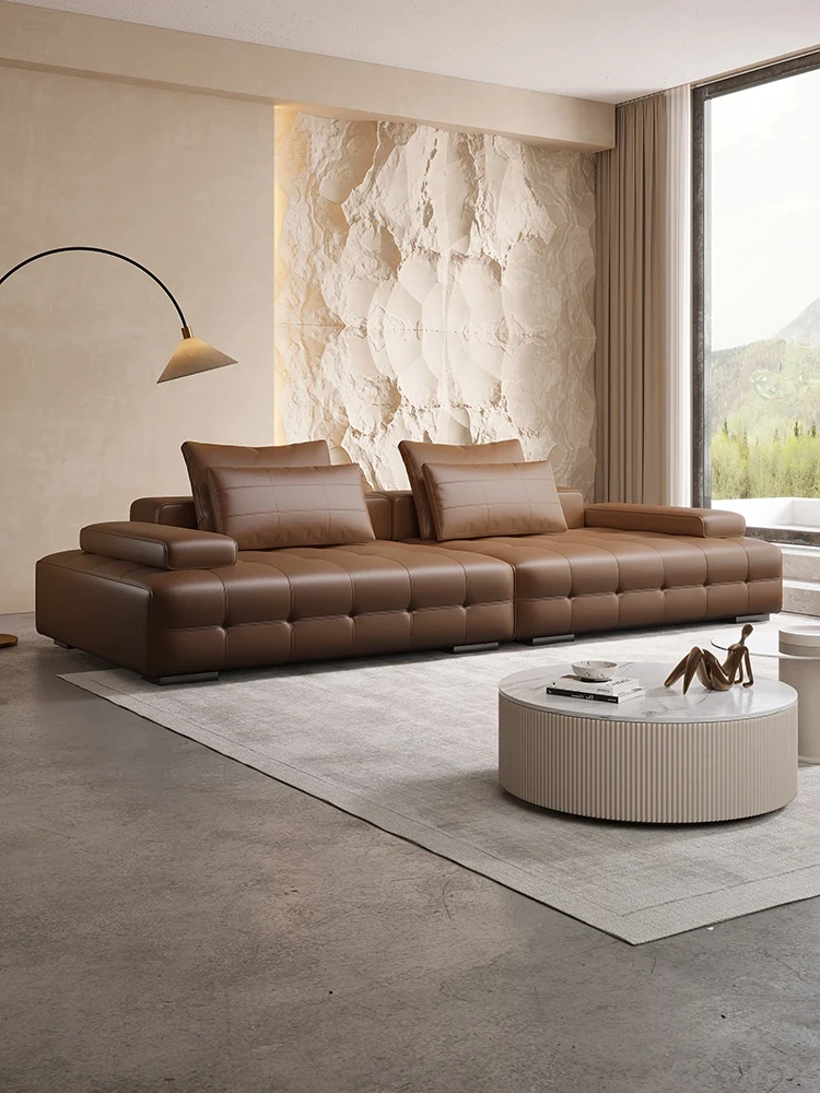 イタリアンミニマリズム本革コーナルディソファ―、現代的なシンプルさとレトロな魅力が共存する、ラグジュアリーなマンションや別荘に最適なダウンフェザー直列配置ソファ。