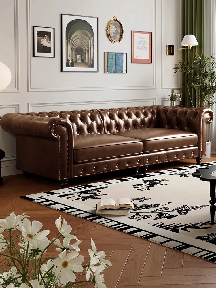 Vintage American-Style Luxury Leather Sofa - European Chic High-End Couch for Spacious Living Rooms, Featuring Elegant Tufted Design