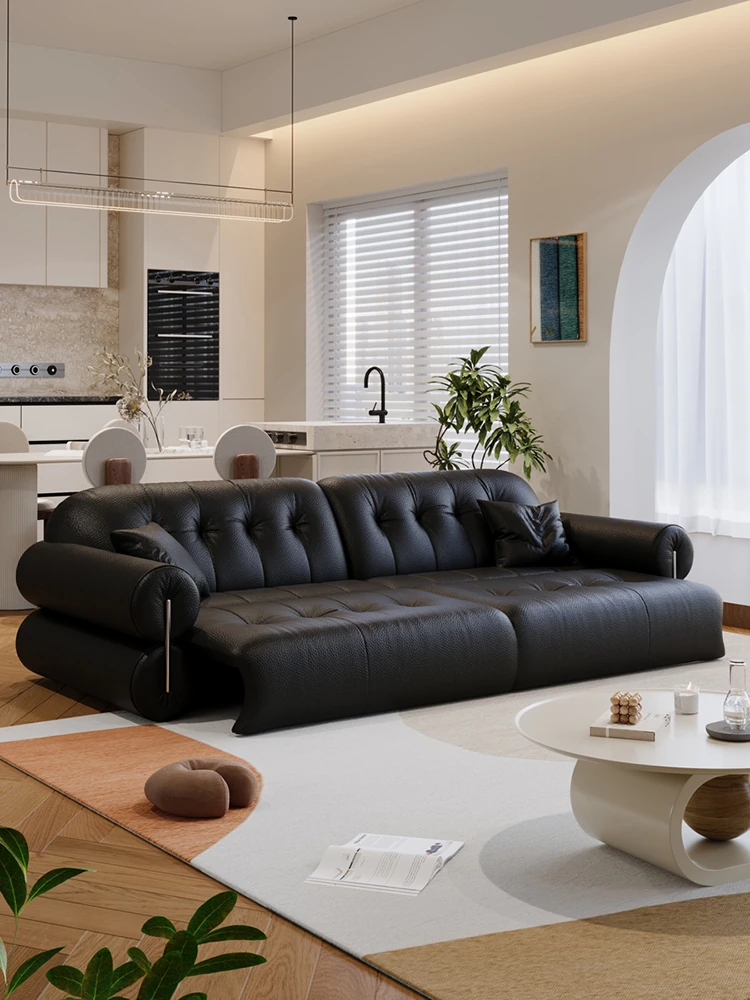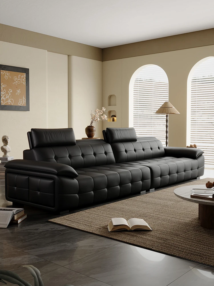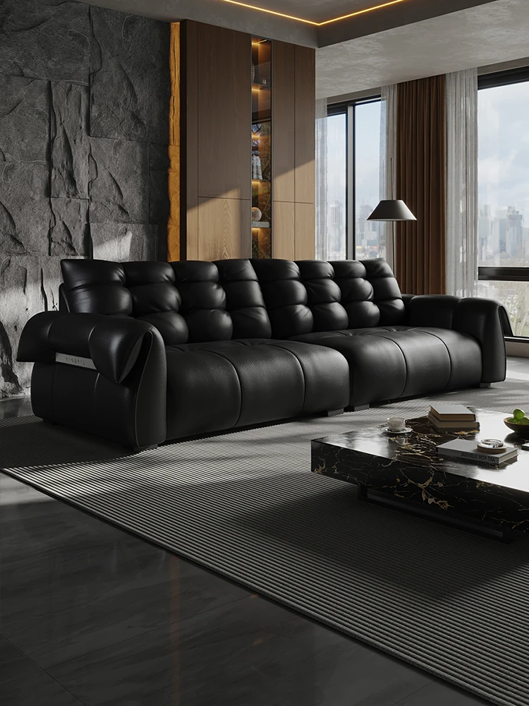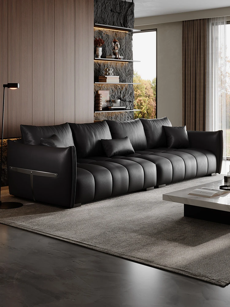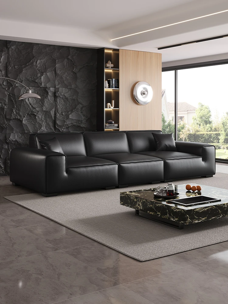Italian Minimalist Luxurious Black Leather Sofa - Genuine Leather, Modern and Sleek Design for Spacious Living Rooms