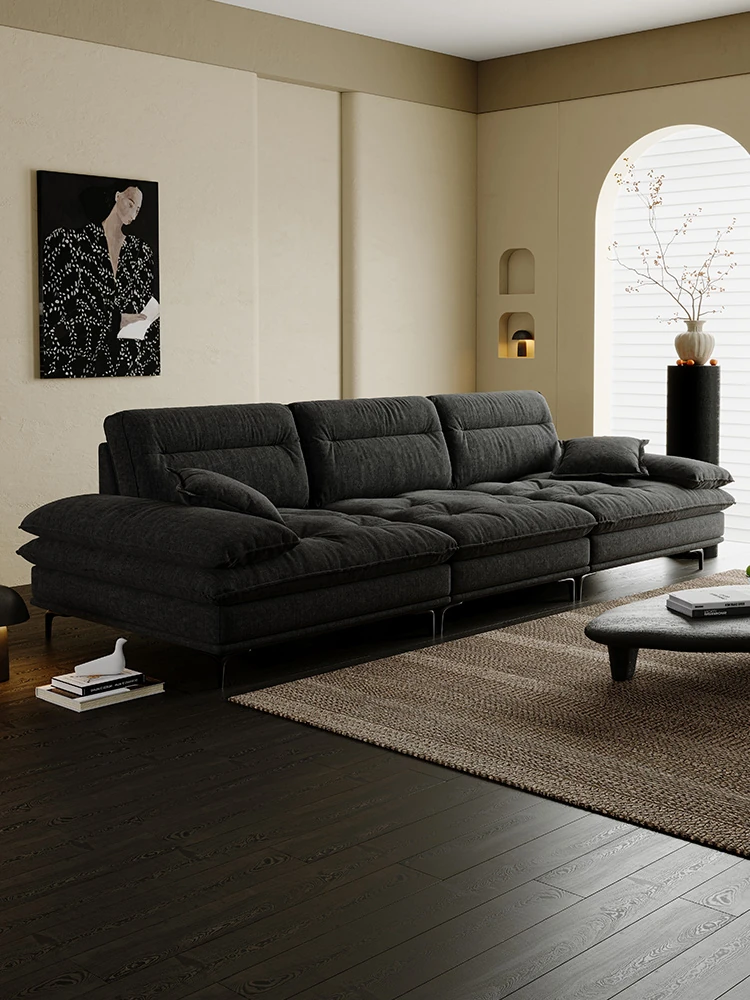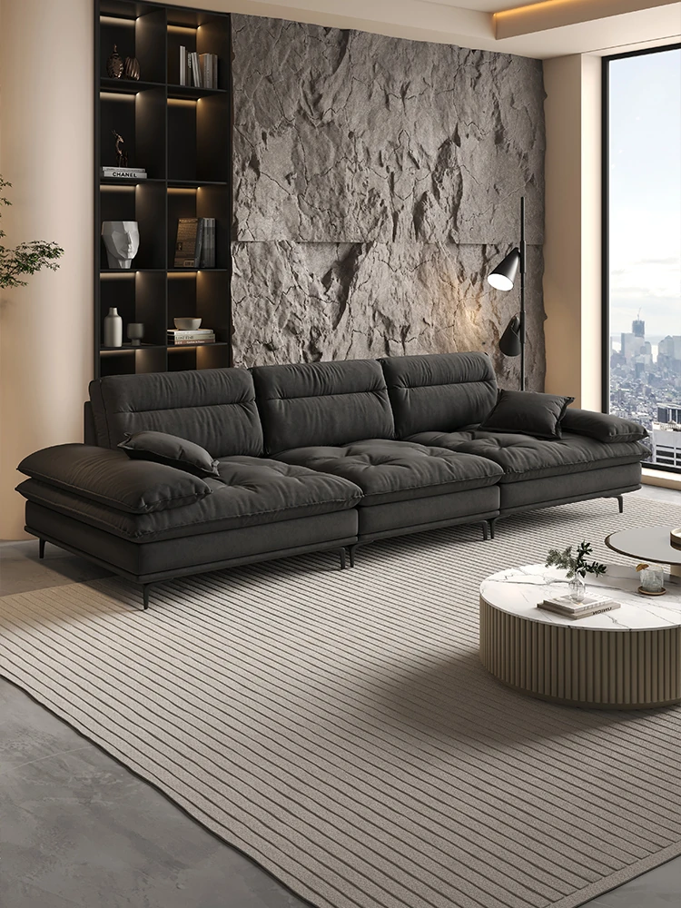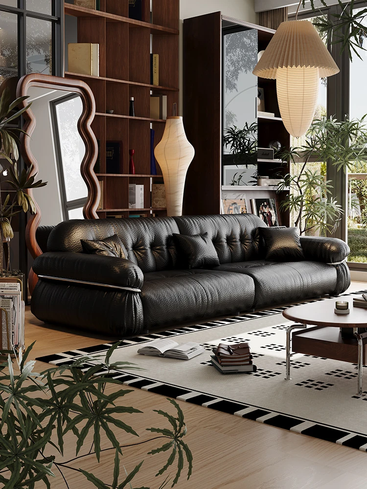 Italian Minimalist Black Jungle Genuine Leather Sofa - Luxurious Down-Filled Design for Villas and Compact Living Rooms
