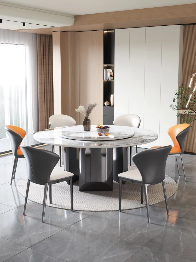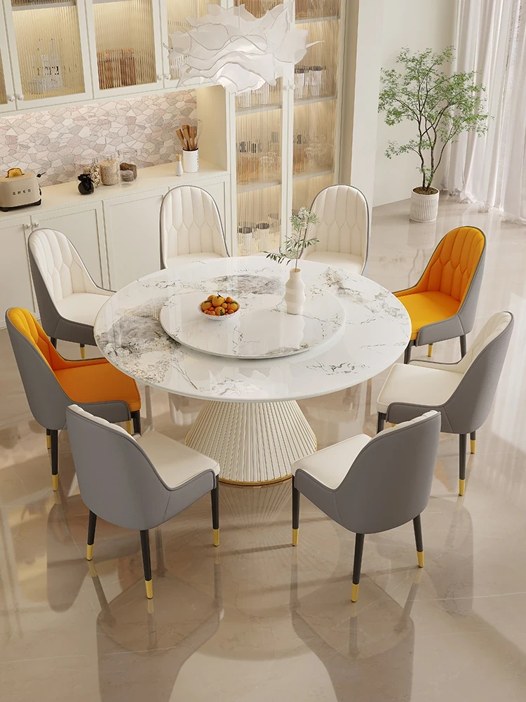 2025年新作!ミニマルデザインの岩盤ダイニングテーブル&チェアセット:大小様々なスペースやホテルのリビングに最適、回転式の大円卓付きで、より快適なお食事のひとときを。