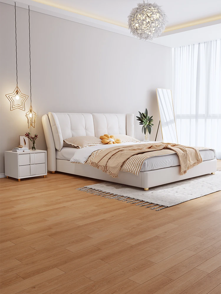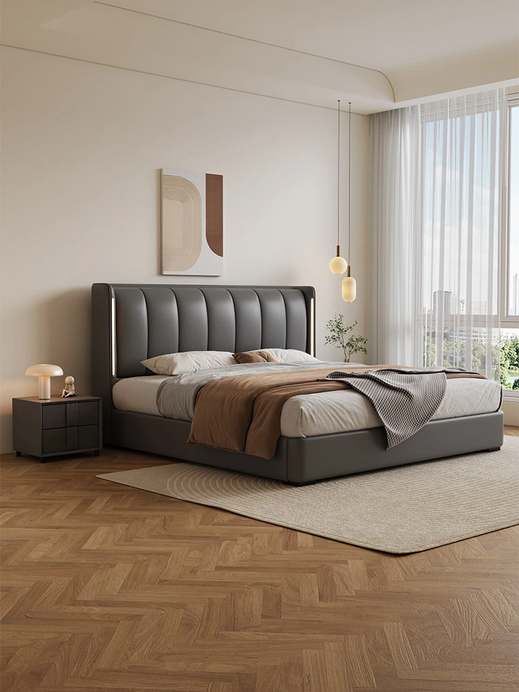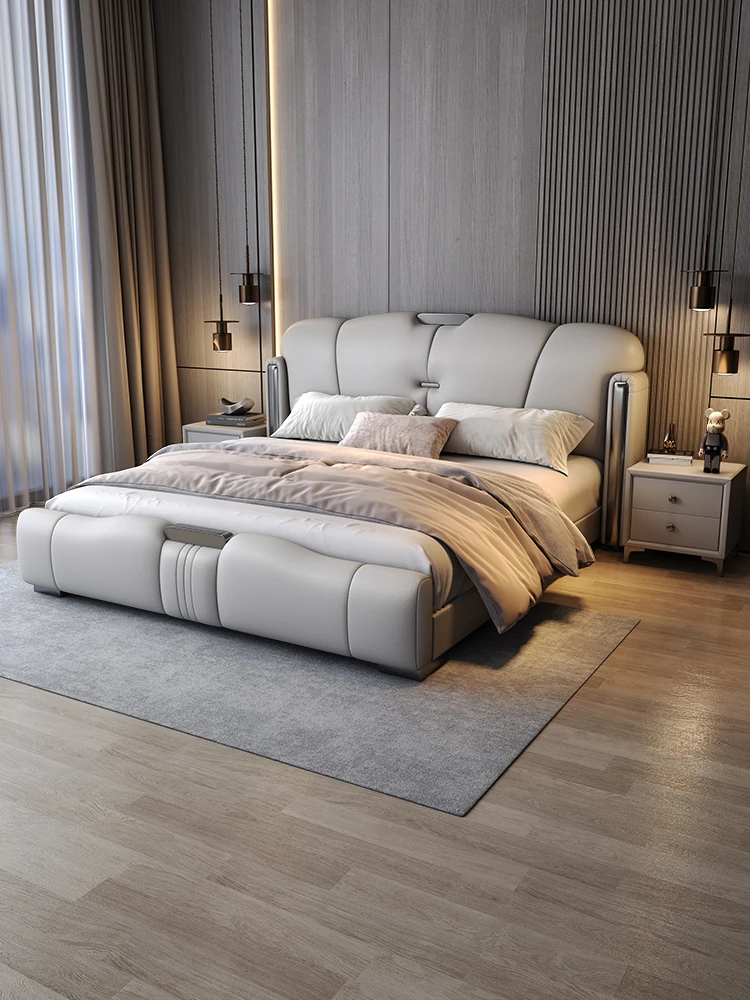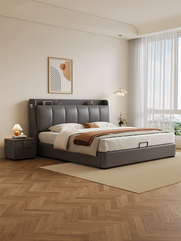 モダンでシンプルなラグジュアリー!多機能ストレージ付きソフトパック本革ベッド。1.5mおよび1.8mのサイズで、主寝室やゲストルームに最適なダブルベッド。快適さとスタイルを両立させた一品です!
