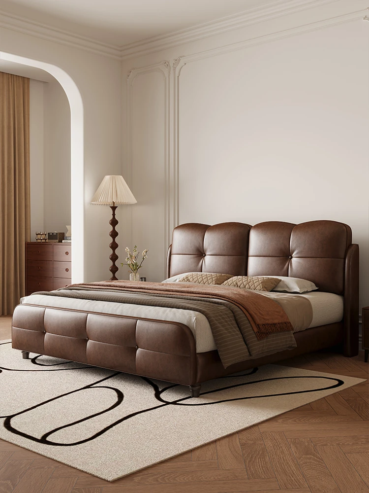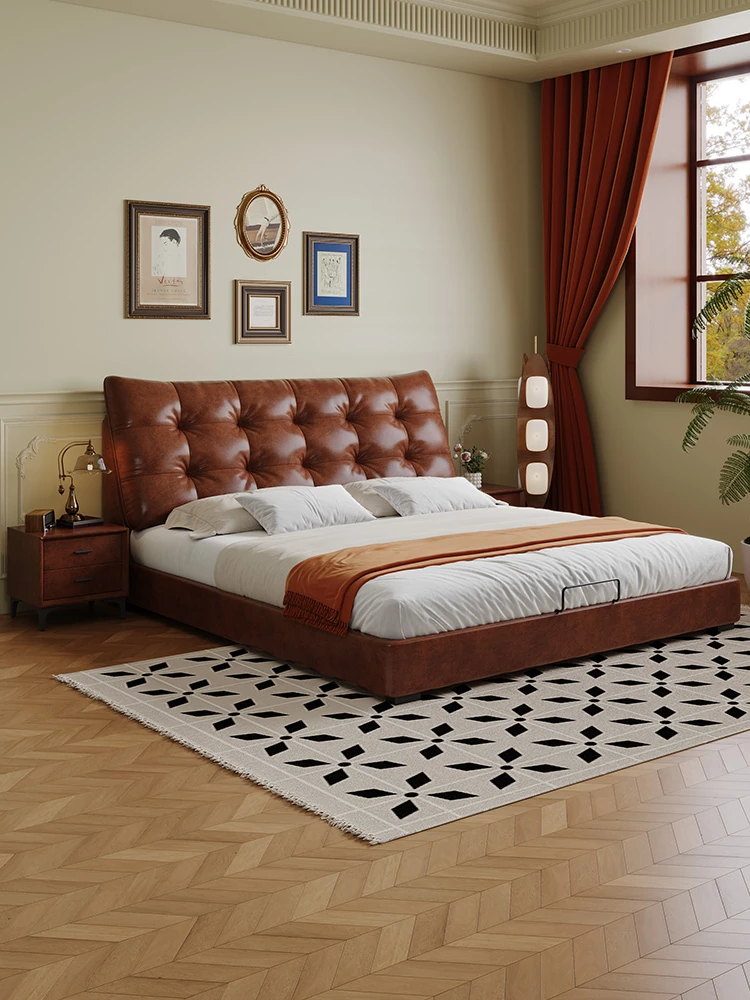 【2025年新作】フレンチレトロモダンスタイルのおしゃれなオイルレザーベッド-1.5m/1.8m ダブルサイズ・ガス圧収納付き主寝室&ゲストルーム用