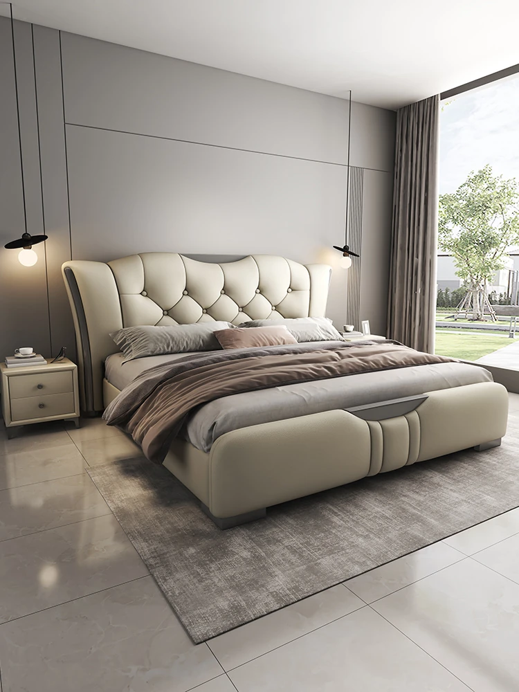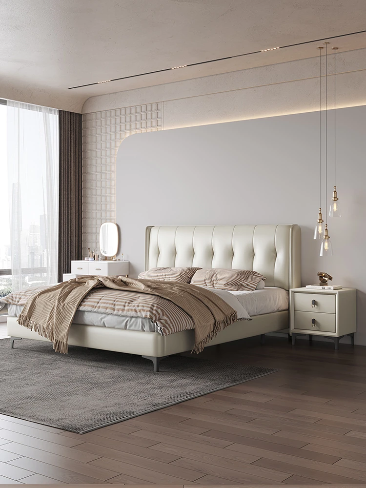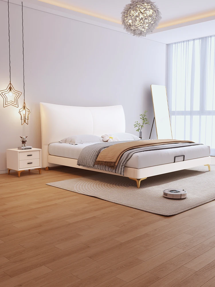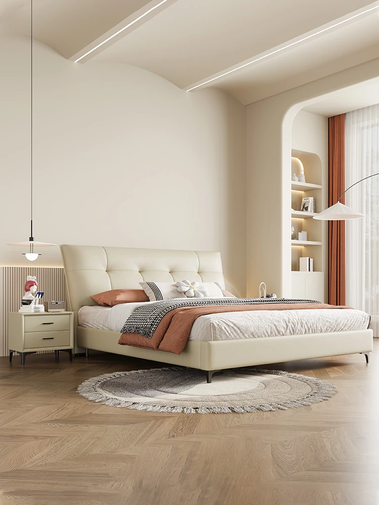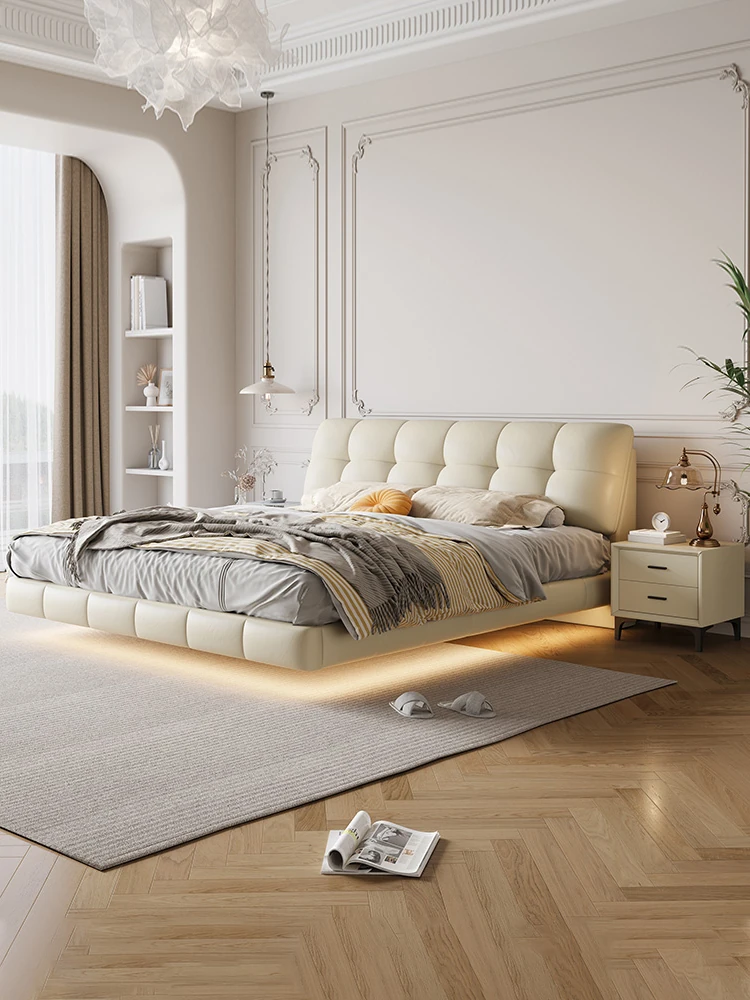 イタリア本革使用!フレンチクリーム風モダンミニマルデザインの1.5m・1.8m主寝室&ゲスト用ラグジュアリー浮遊ダブルベッド。