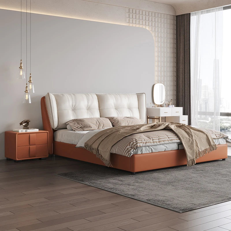 ローレンス本革フレームベッド - シンプルでモダンなイタリアンラグジュアリー、極上のダブルベッド。1.5m & 1.8mサイズ、洗練されたデザインで理想の婚礼ベッドを実現!