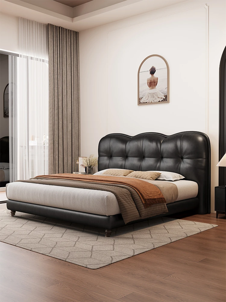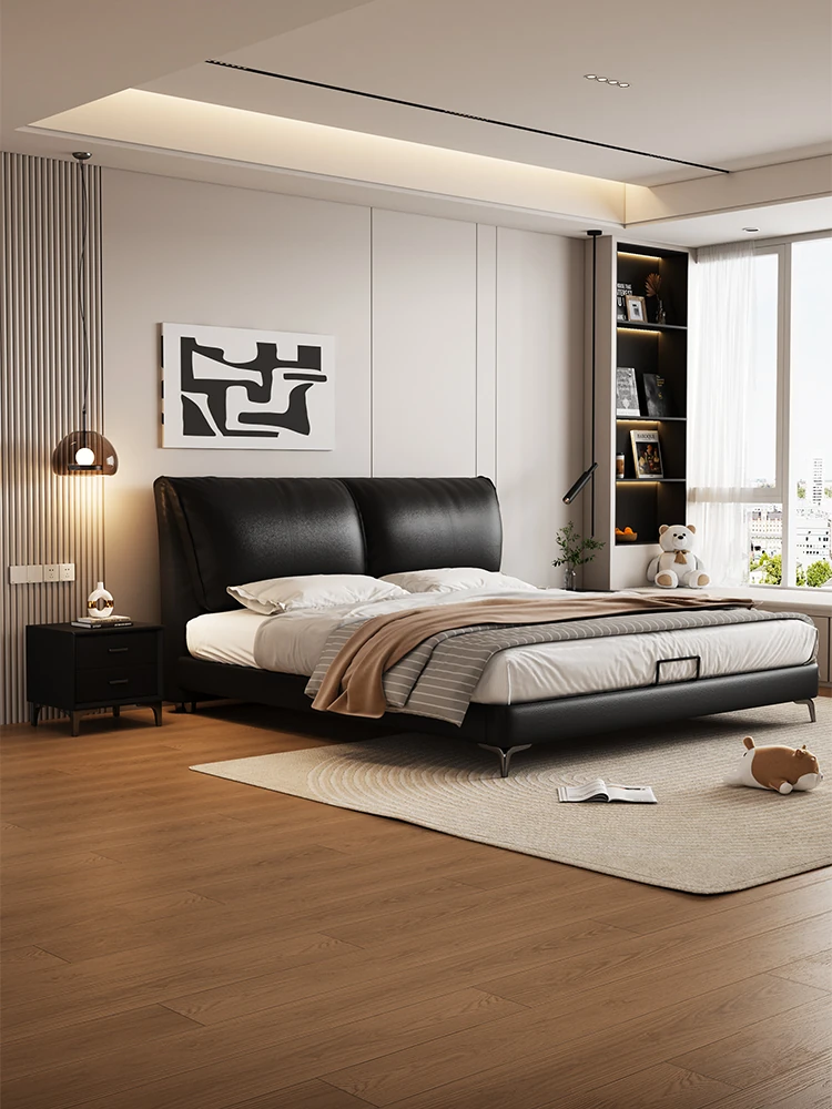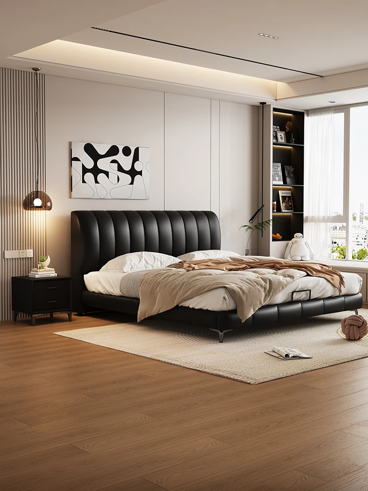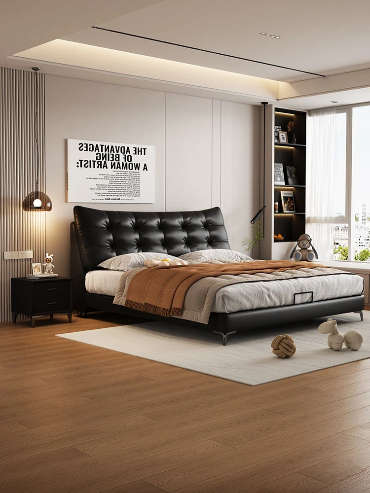 軽奢風ディオール本革ビッグブラックベアダブルベッド - モダンでシンプルなデザイン、1.5mと1.8mのサイズが選べる、快適なソフトバックレザー製ベッドで、主寝室や客室に最適です。