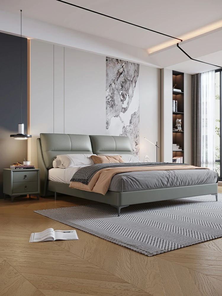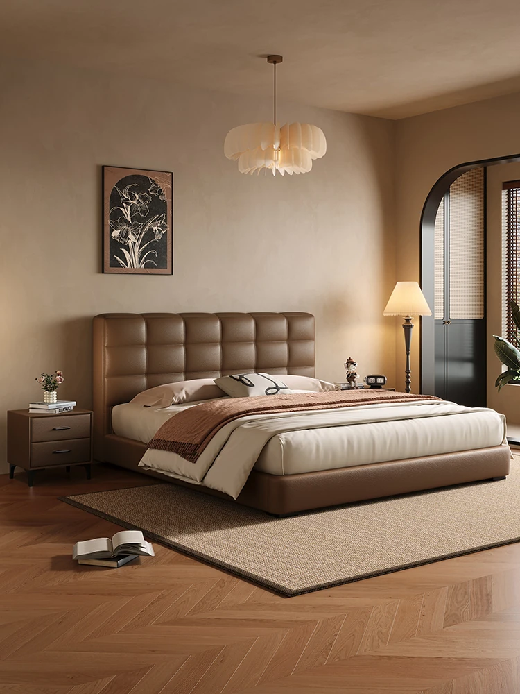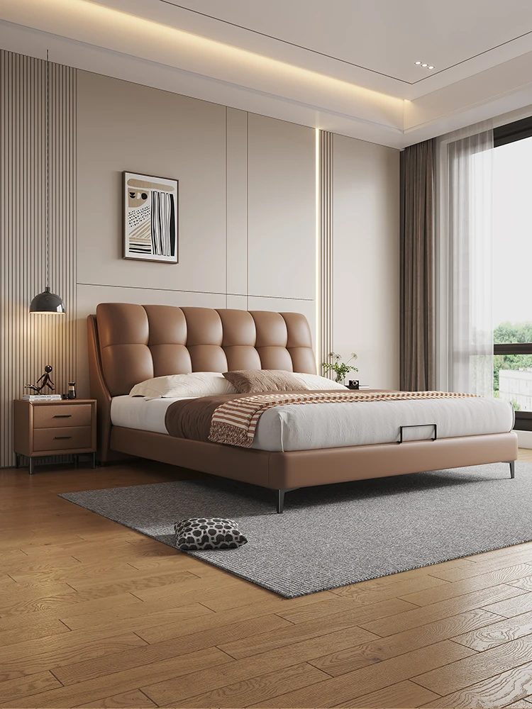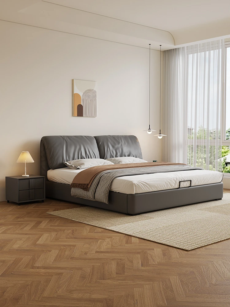 イタリアンミニマリズムの1.5m×1.8m背もたれクッション付きダブルレザー製ベッド、高脚デザイン!2025年新作、モダンでシンプルな主寝室にぴったり。快適な睡眠をお届けします!