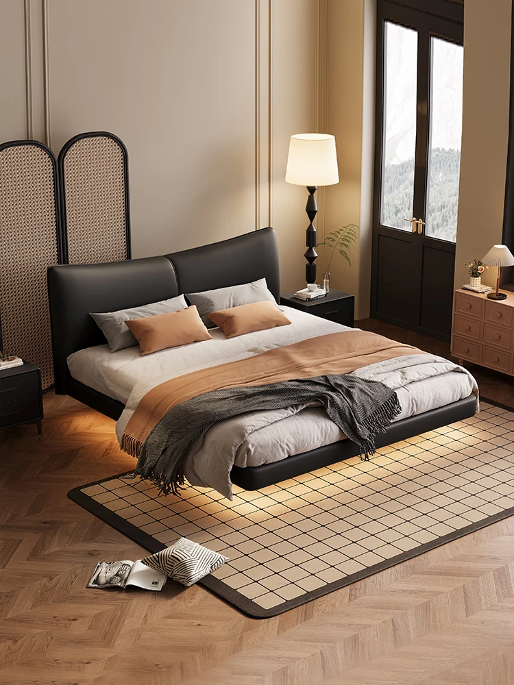 イタリアンミニマリズム本革フローティングダブルベッド - モダンでシンプルなデザイン、1.5m・1.8mの選択肢あり、快適なウレタンソフトバック付きで、主寝室やサブ寝室に最適です。