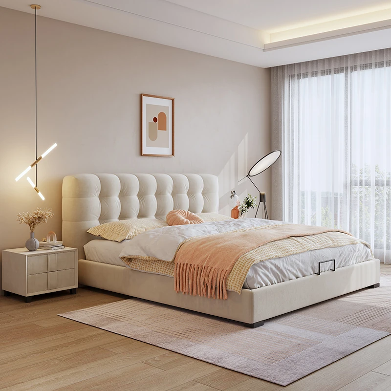 2025年最新フレンチクリーム風キャットスクラッチ加工ベッド - シンプルでモダンなデザイン、主寝室・サブ寝室に最適!選べる1.5m・1.8mサイズで贅沢なダブルライフを。