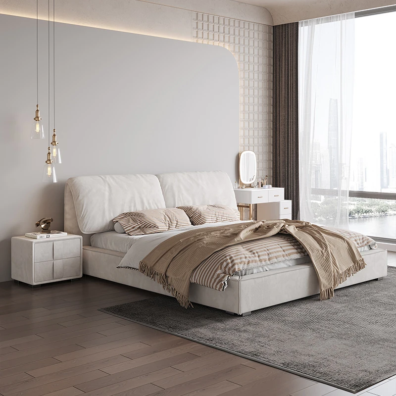 イタリアンミニマル侘寂スタイルのマットフロアテック布ダブルベッド、主寝室・客室兼用、1.8m・1.5mサイズ、柔らかなパッディング背もたれ付き。洗練されたデザインで心地よい眠りを提供します。