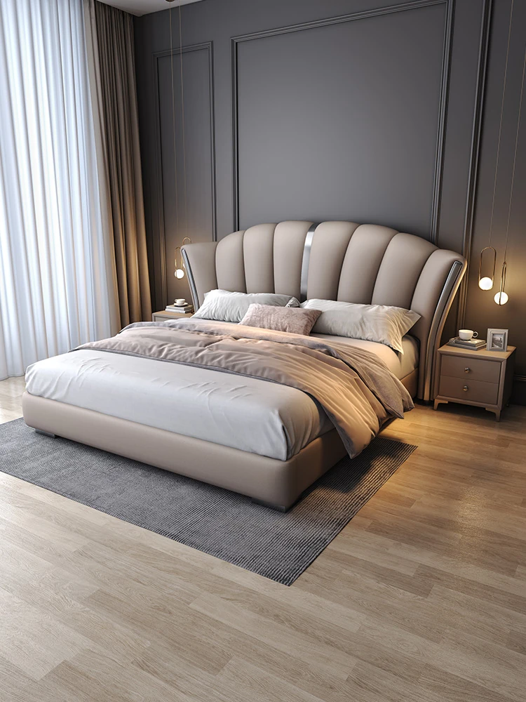 イタリアンスタイル エレガントなヘッドボード付き 1.5m・1.8m 本革浮遊ベッド - シンプルモダンなデザインの高級ダブルベッド、極上の快適さで新婚生活を贅沢に彩ります。