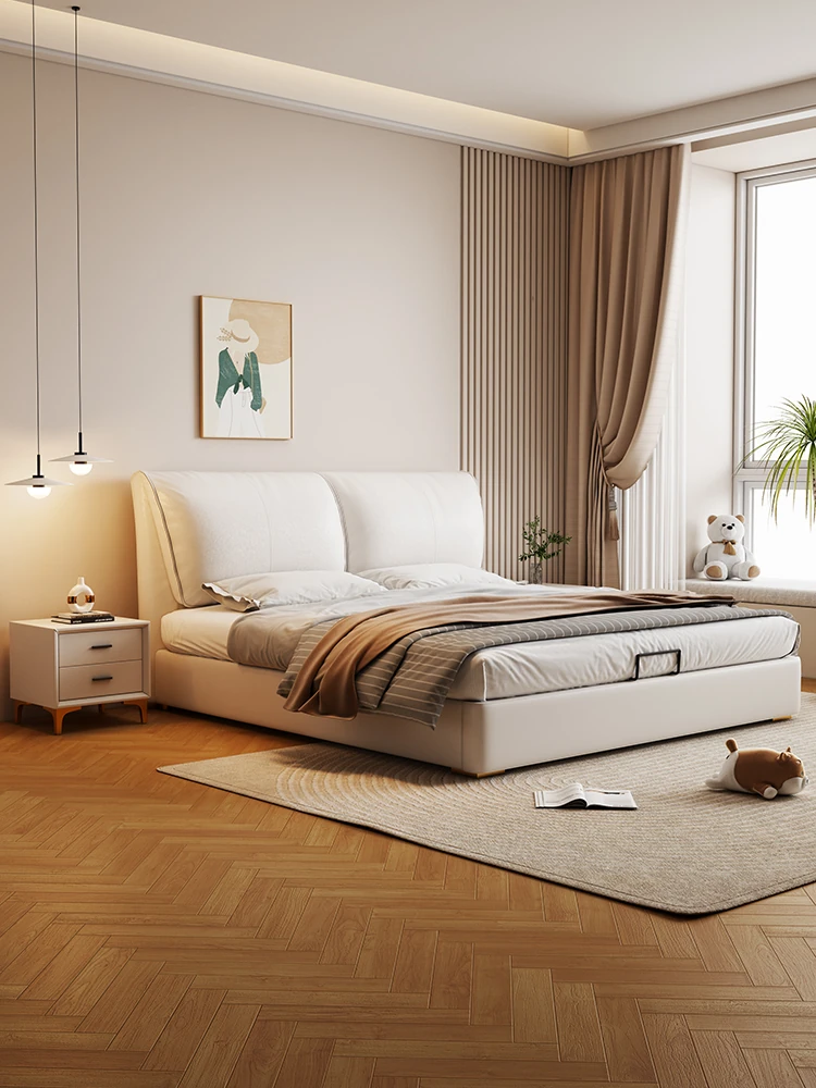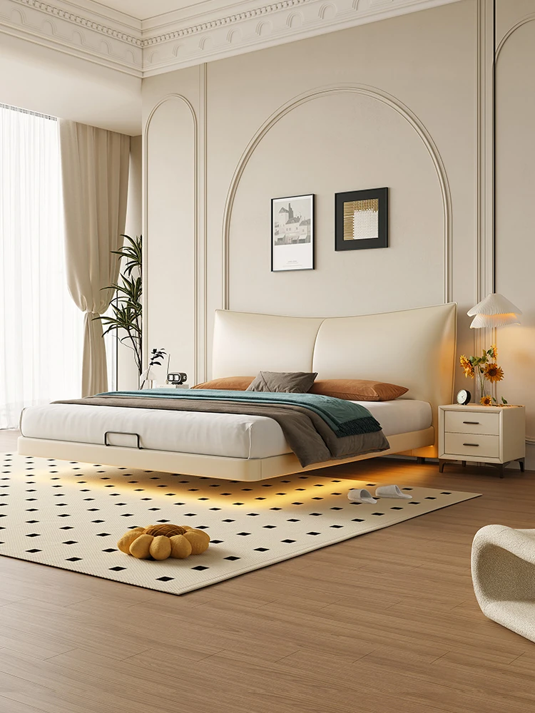 2025年新登場!優雅なフレンチクリームスタイルのキュートな象形キャットスクラッチ皮革の浮遊ベッド。モダンでシンプルな寝室デザインにぴったりの1.5m・1.8mサイズ婚礼ベッド!